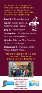 The summer kicks off in downtown Albion on Friday, June 3 when we bring food trucks, Lifesize Games, and a corn hole tourney and cash bar downtown during the Chain O'Lakes Festival Car Show! Planning is in the early stages, so be sure to check back on this website for more information in coming weeks.